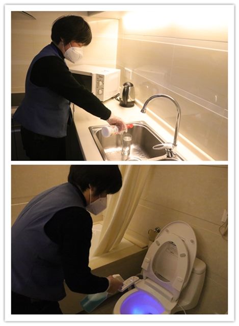 邱仲紅看在眼里急在心里,心想,如果自己輪休在家,萬一替班同事與客人溝通不順暢怎么辦?于是,她主動申請上班,每天進房后第一件事就是開窗通風,把房間打掃干凈。然后,按防疫程序,將門把手、遙控器、電話、五金件,就連快遞送入房間前都會用酒精逐一消毒,確保衛生安全。