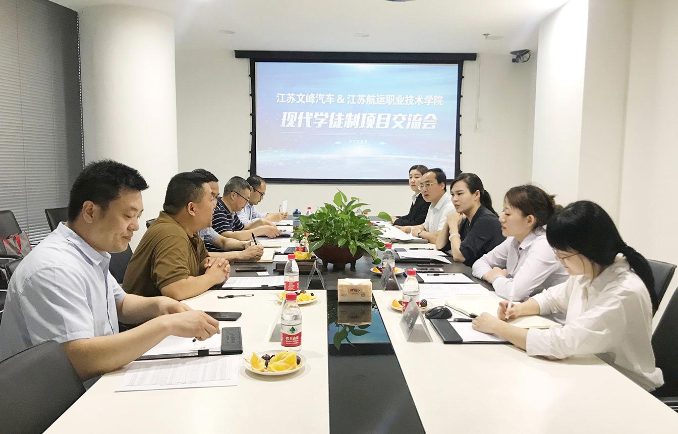 6月6日下午,文峰汽車&江蘇航運職業技術學院“現代學徒制”項目交流會在文峰汽車總部會議室舉行。文峰汽車副總經理顧毅、人力資源總監唐平、航運學院交通工程系黨總支書記王劍華、主任朱永祥、副書記、副主任汪曉輝、副主任李勝永、黨政辦主任張智華博士等人共同出席會議。