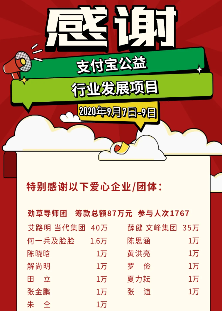 在阿拉善SEE公益機構發布的「支付寶公益/行業發展項目」中,“勁草導師團”共籌款87萬元,參與人次達到了1767次。其中,薛健籌款35萬元。