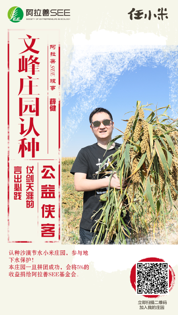 阿拉善,蒙語意為“五彩斑斕之地”,由于干旱少雨,荒漠化治理任重道遠。為控制阿拉善地區(qū)沙漠蔓延,保護地下水資源,阿拉善SEE生態(tài)協(xié)會與內(nèi)蒙古阿拉善左旗政府合作,共同推動節(jié)水小米的種植,這種沙漠小米被稱為“任小米”。